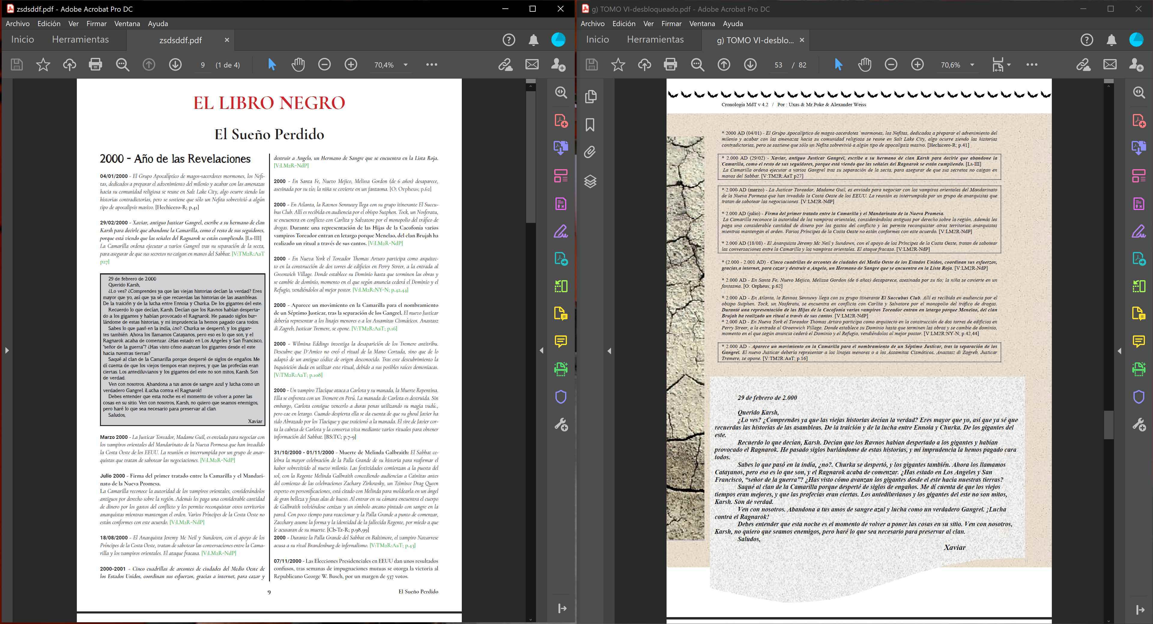 Llevo unos días mirando la antigua cronología y con lo del usuario brasileño, me encantaría poder participar en una nueva versión. La 4.2 se ha quedado obsoleta, tanto en info como en maquetación. He copypasteado unas páginas sueltas y puesto un diseño más acorde con V5. Mis conocimientos de MdT son MUY limitados, pero se podría hacer un trabajo organizado (con el beneplácito de MrPoke y Uxas (diría que el de Alexander se tendría fácilHace tiempo participé con otros usuarios, Uxas y Mr. Poke, en la elaboración de esta cronología de Mundo de Tinieblas. A estas alturas necesitaría algo de actualización para los últimos años.