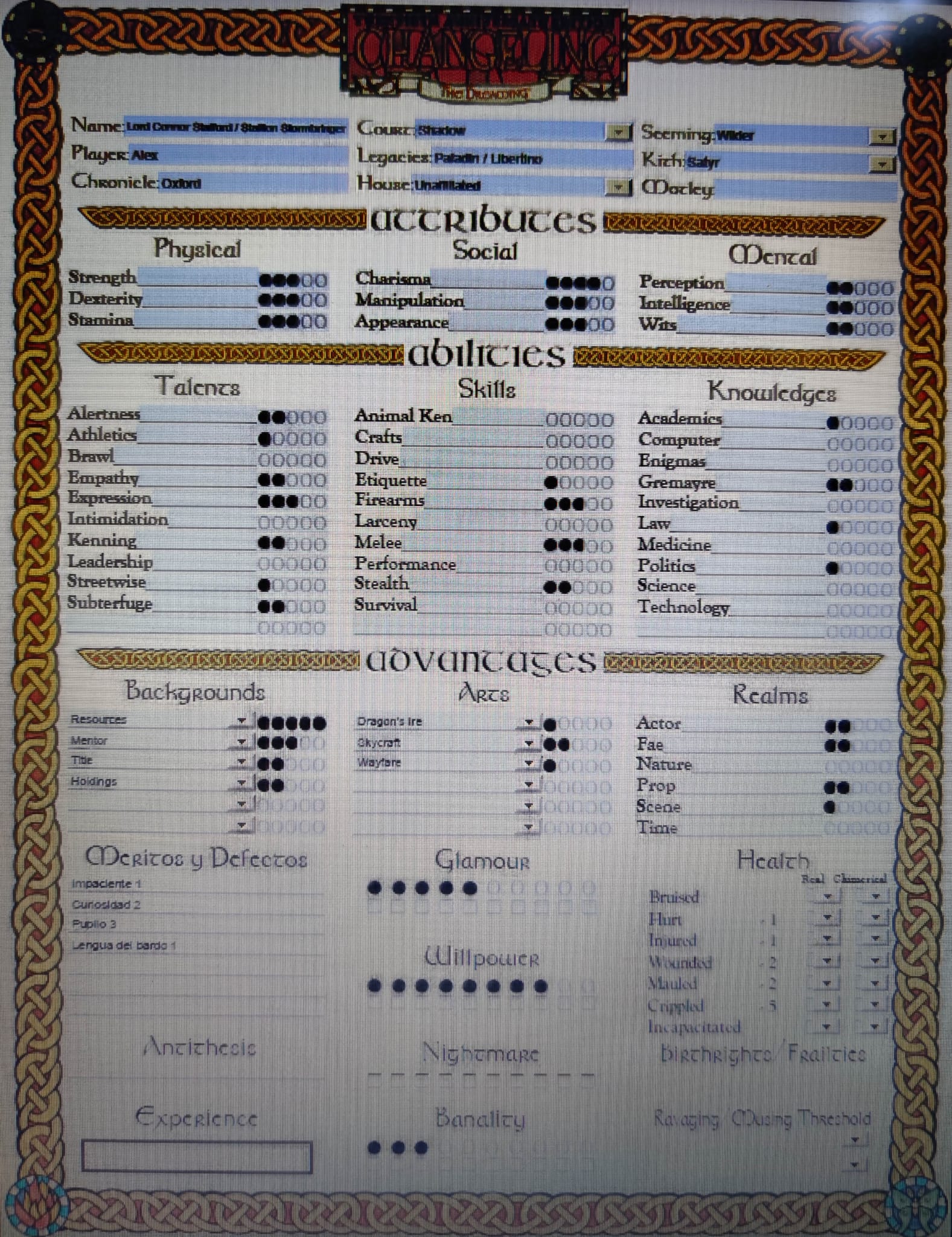A continuación adjunto 4 personajes pregenerados (con sus puntos gratuitos gastados y todo para completar la ficha) para las aventuras de la ciudad de las agujas de Ensueño, (y todas sus continuaciones futuras) bajo sus nombres féericos y humanos. Una Pooka-ardilla estudiante de enfermería de origen danés con problemas para mentir (Scarlett - Sam Bruun), una caprichosa Nocker italiana con un don para la electrónica (Attrezza - Estella Rega), un Redcap deportista con sentido de la empatía de origen escocés (Aodh - Eric Duff) y un Sluagh inglés estudiante de literatura y del buen vino (Nash Hush - Jack Owen). Adjunto también imágenes de sus apariencias féericas y humanas.
