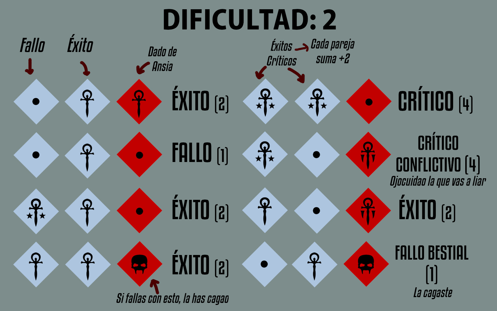 Dados de ansia (críticos conflictivos y fallos bestiales). Nunca se tiran dados de ansia en las tiradas de controles de enardecimiento, FV o