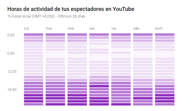 Os adjunto en este post una imagen con las horas en las que nuestros espectadores están activos en Youtube. Aunque suelo programar yo los vídeos por aquello sobre todo de que no coincidan dos en un mismo día, el gráfico es una pista de cara a vuestros directos, etc. si queréis que puedan tener más visualizaciones (que puede que lo queráis, puede que no, ahí ya no me meto).