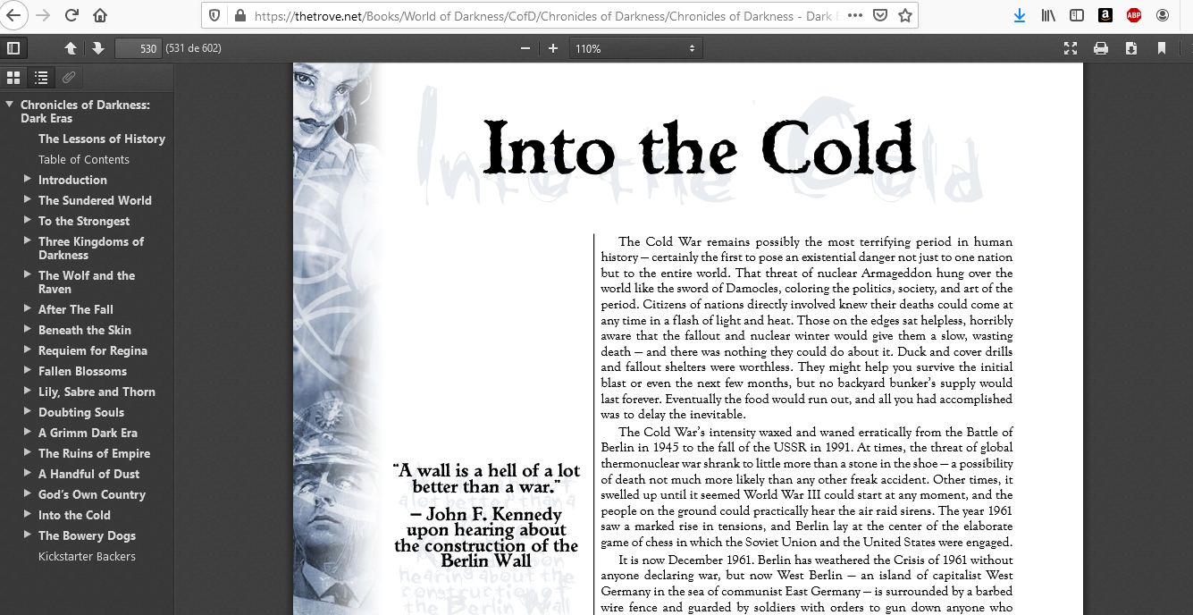 Pues hombre, el Companion de Edad Oscura no es lo que tengo más presente, la verdad. Tampoco creo que sea un elemento muy característico del juego. En fin, hay varios elementos históricos en Requiem, conectados a través de la historia de las sectas y su vinculación con la Camarilla de Requiem for Rome, los dos libros de Dark Eras y un libro entero de líneas de sangre ubicadas en marcos temporales muy particulares.