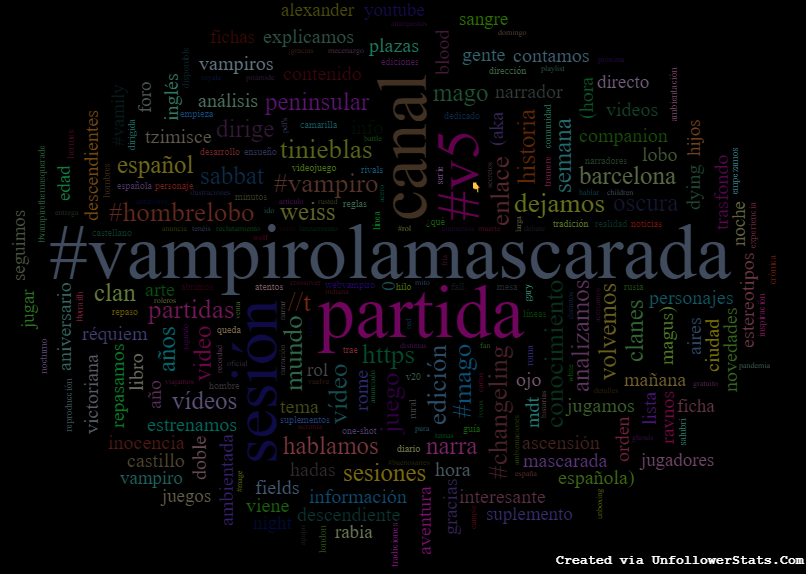 Interesante... ¿Esa lista es en total que se empleó en esa cuenta de twitter, o dentro de cierto periodo? es que pregunto, por que el tamaño de V20 es mucho mas pequeño que V5, que supongo que el tamaño es la frecuencia, ycreo que es más logico que sea por ejemplo dentro del ultimo año ni no desde los casi X años que fue creada.Voivoda escribió: 22 Ago 2021, 01:41 Sólo como curiosidad os dejo la nube de palabras más utilizadas en la cuenta de Twitter de Webvampiro.