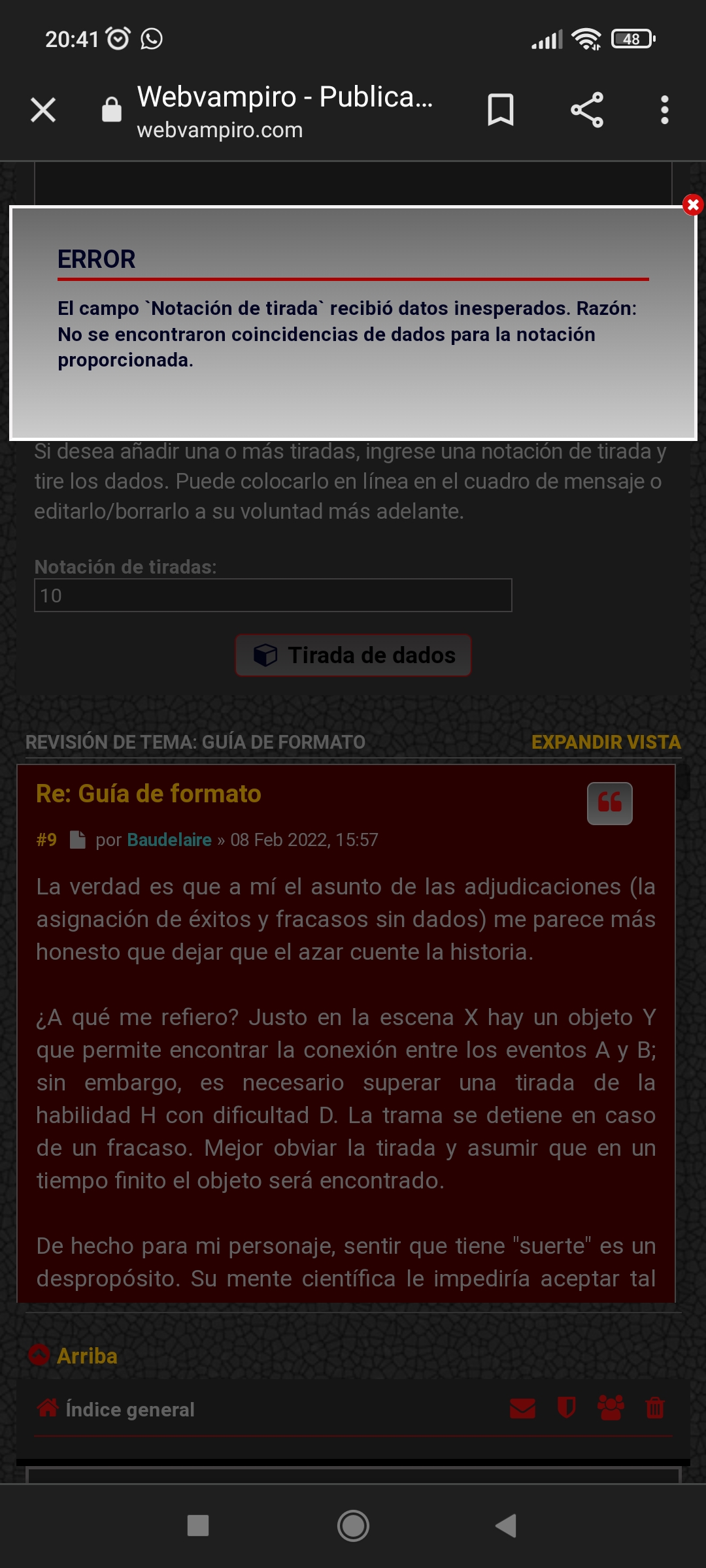 De mi parte, dado que a veces tengo problemas de conexión o en momentos en que experimento algún tipo de lentitud asociada a otras actividades (o una ausencia completa, como este fin de semana), prefiero evitar cualquier retraso. Acepto que el narrador lance por mí los dados o, mejor todavía, que adjudique el éxito o fracaso en el nivel que le parezca (sin tirada alguna). ;)