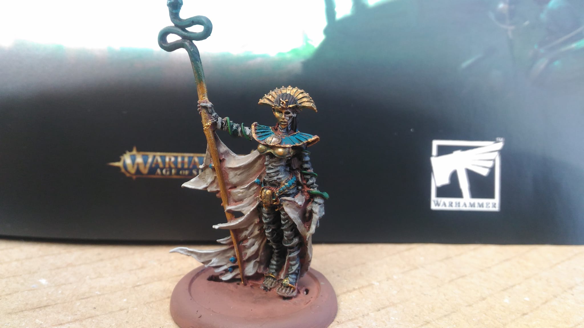 Y los Reyes Funerarios son un caso bastante particular en los universos de fantasía, a primera vista, un ejército de esqueletos, constructos y no-muertos de inspiración egipcia, el viejo mito asociado a la maldición de los faraones y los peligros del desierto egipcio convertidos en realidad. Las miniaturas no eran brillantes para la época y el estilo de juego, enormes falanges de esqueletos silenciosos avanzando lentamente, no los hizo muy populares. Pero aun así, tuvo una legión enorme de aficionados, llegando a ser una de las versiones más populares del no-muerto egipcio en el arte que he visto.