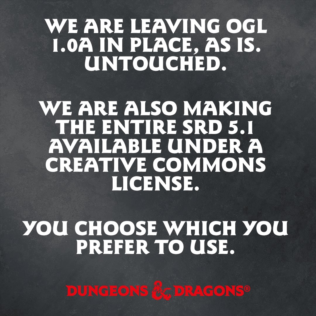 Yo no siento esta como una victoria del pueblo, ellos se van a traer algo entremanos. Yo apostaría que D&D One va a seguir con su OGL pero Wizard va hacer la cosa más monetizable con cosas brillantes, muñequitos y ganchos, lootboxes roleras, vete a tu a saber, va a sacar mucho material con el otro. los roleros de memoria corta se van a enganchar y se van a olvidar de todo este problema.