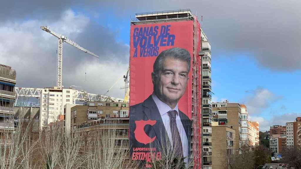 Hay mucho madridista cabreado por esta pancarta de campaña de Laporta al lado del Bernabéu, pero a mí me parece una genialidad.