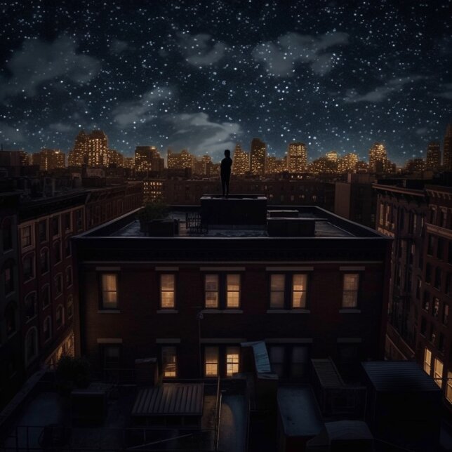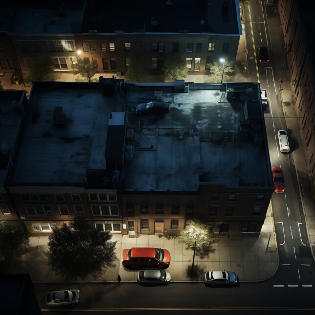 Apago la linterna y muestro ambas manos en alto mientras busco un angulo desde el cual no fueramos visibles desde la azotea de enfrente. No podía apartar la mirada de sus ojos. Me temía lo peor. Parecía que me iba a saltar al pecho en cualquier momento.