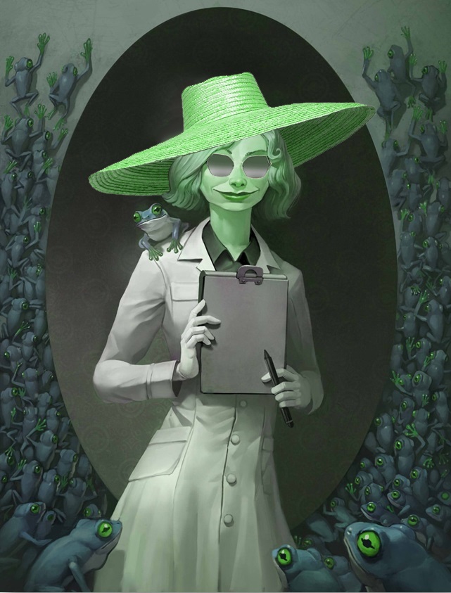 Lo único que tiene la ficha de extraño es las abreviaturas que usé para los diferentes poderes (contratos) que si no no me cabían pero que podéis consultar aquí y también el mérito "Montura feérica" que mi personaje tiene en realidad un pequeño acompañante feérico (una quimera) que es esta ranita. Ah y en el apartado de compromisos puse la descripción de mi hilo y agujas (me parece más útil escribirlo ahí para no consultarlo siempre xd). Los contratos están relacionados con las almas de estos renacuajos fallecidos, el pesar, los espejos y trepar como una rana... Pero me encanta el trasfondo del personaje la verdad.