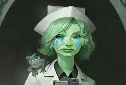 Amelia es una Oscuro de la Corte del Invierno (una especie de Sluagh tristona si conocéis un poquito de Changeling el Ensueño). Es una matrona que hacía miles de tests de rana en otros países para comprobar si las mujeres estaban en cinta. Ella irónicamente deseaba fervientemente tener un hijo propio pero era infértil y como matrona no lo llevó nada bien. Hasta que un hada verdadera llamada La viuda del pantano la engañó prometiéndole ser capaz de engendrar un hijo humano a cambio de su servicio en Arcadia. Pasó allí mucho tiempo engañada esperando hasta que la rescataron. Cuando llegó al mundo humano quedó automáticamente embarazada y pensó que se trataba de la recompensa del hada verdadera pero no. El día de su parto, que duró nada menos que una semana, parió miles de renacuajos fallecidos en su propia bañera. Era un parto de pesadilla. De todos los renacuajos uno sobrevivió y ella, a pesar de que no es realmente un hijo, lo trata con cariño. Recuerda con tormento ese día. Desde entonces Amelia, refugiándose en su dolor, se afiliaría a la Corte del Invierno, alimentándose del pesar de los demás allá a donde va. Desde entonces cuando ejerce su trabajo entristece a las embarazadas o recientes mamás creándoles inseguridades sobre el cuidado de ellas y sus hijos "para ser mejor madre".