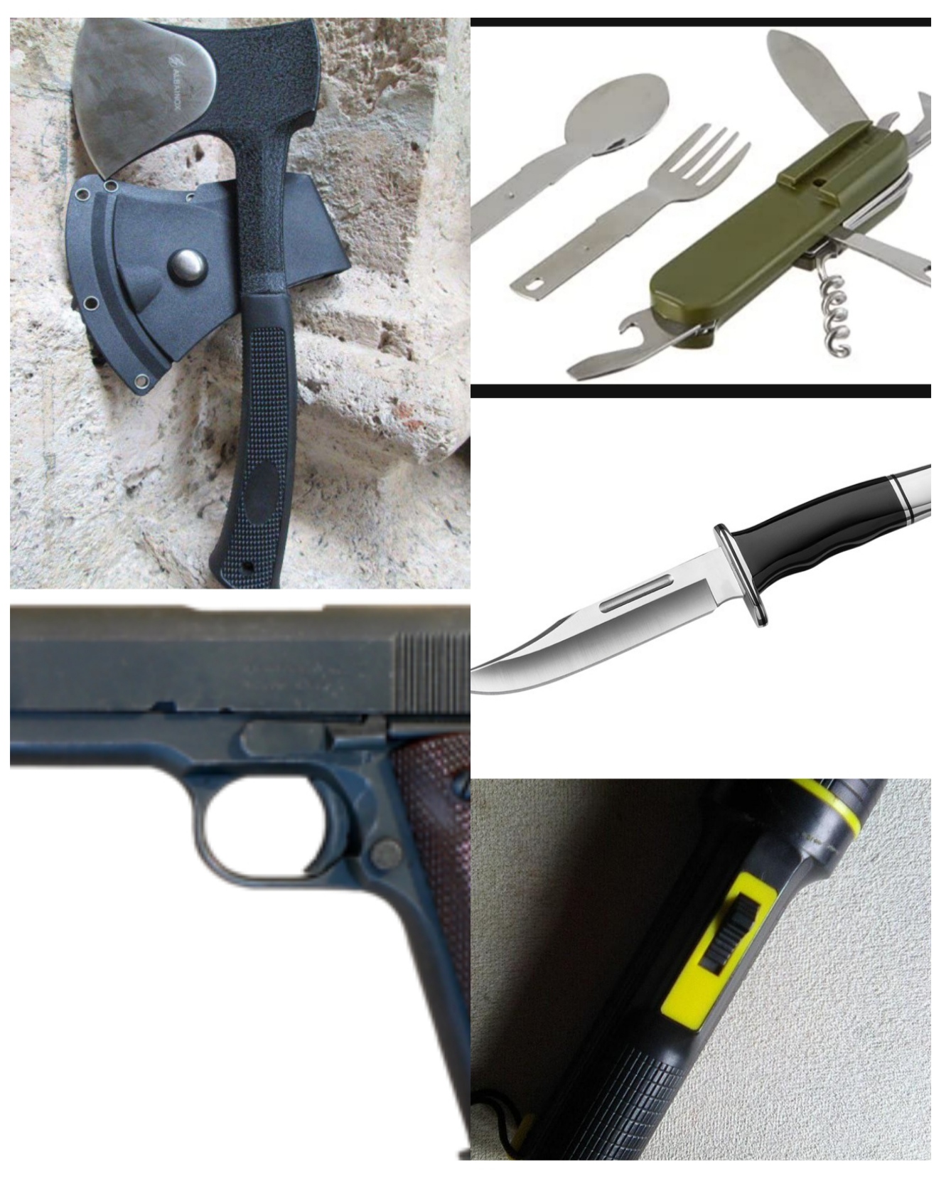 BlackBerry 850, navaja multiusos, hacha deportiva, M1911A1, Linterna, toalla pequeña, una muda (prácticamente igual que la ropa que llevo puesta), un Bowie y el colgante de Martín Scorsso.
